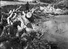 Channel change #2 before turning river through. New Civilian Conservation Corps (CCC) rock quarry opened up to complete river projects. Man on bank. ; ZION Museum and Archives Image ZION 13651 ; ZION 13651