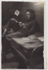 A man writes on a bunk in a dim space