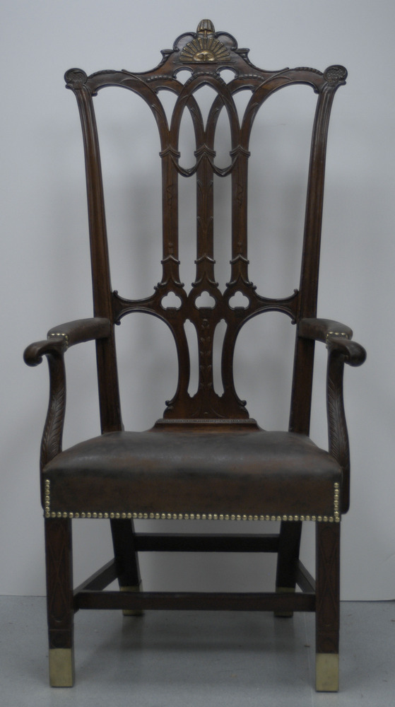Large mahogany armchair with leather upholstered seat, pierced decorative back splat and carved sun in top crest rail.