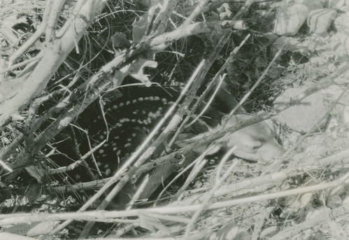 California Mule Deer. Close-up of fawn hiding under driftwood. Inside view. Locality: Yosemite National Park. Negative #: 181. Location of Negative: Region Four Headquarters. [This information comes from the reverse of the envelope for this negative number.].