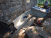 A NPS worker is seen in the background to the right. He is working on the rubber moisture barrier. The historic masonry foundation is repaired with the footer installation. Construction tools and wood boards are seen near the newly installed footer.