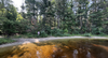 A calm, forested lakeshore with clear brown water, dense trees, and a small houseboat sign near the shoreline.