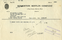 Receipt from Houghton Mifflin Company to George B. Dorr for the book, "Great Poets and Meaning of Life". Shipped to Dorr's Department of the Interior address at Bar Harbor. Dated March 20, 1937 and paid on March 30, 1937. See following entry for related material: "Receipt, Mifflin to Dorr, March 30, 1937 p.2.tif"