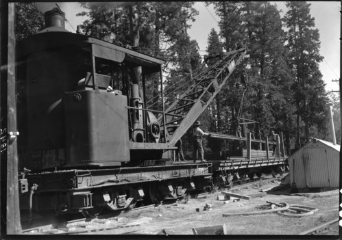 Copy Neg: 1991/1992. Yosemite Lumber Co. loading logs with steam crane.