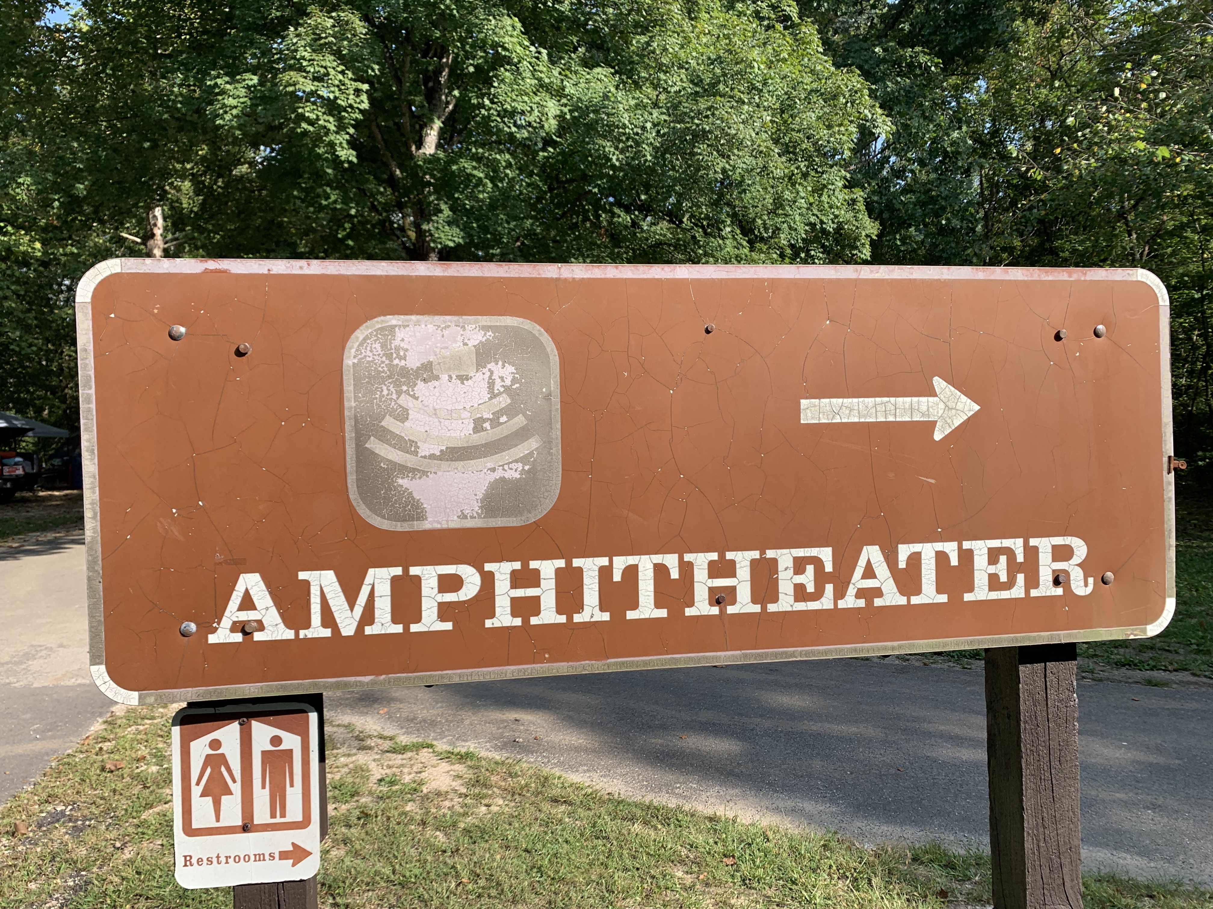 A faded brown park sign, with arrow to right, text: Amphitheater.
