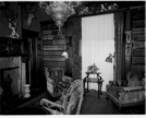 The Den is on the southeast side of the Hall, immediately east of the South Foyer leading to the Living Room. The 22'-2" x 18'-5" space includes an arched, semi-elliptical alcove at the west end. The 2-1/4" wide floorboards are arranged in a herringbone pattern. The walls are finished in painted plaster above a paneled wainscot of Santo Domingo mahogany, composed of vertical arched panels set between carved pilaster-like stiles and below ornately carved friezes. A crown molding at the top of the wainscot forms a shallow ledge.