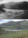 Photos and photo pairs are pre-approved for educational use ONLY. To use them in educational products, credit them the same way as they are credited on the website, Photo Credit: Original photographer: Herbert Heller (#79-44-1439, UAF Archives); Rephoto photographer: Carl Roland. For any other use beyond education, contact Denali National Park and Preserve for additional copyright information on specific images of interest.