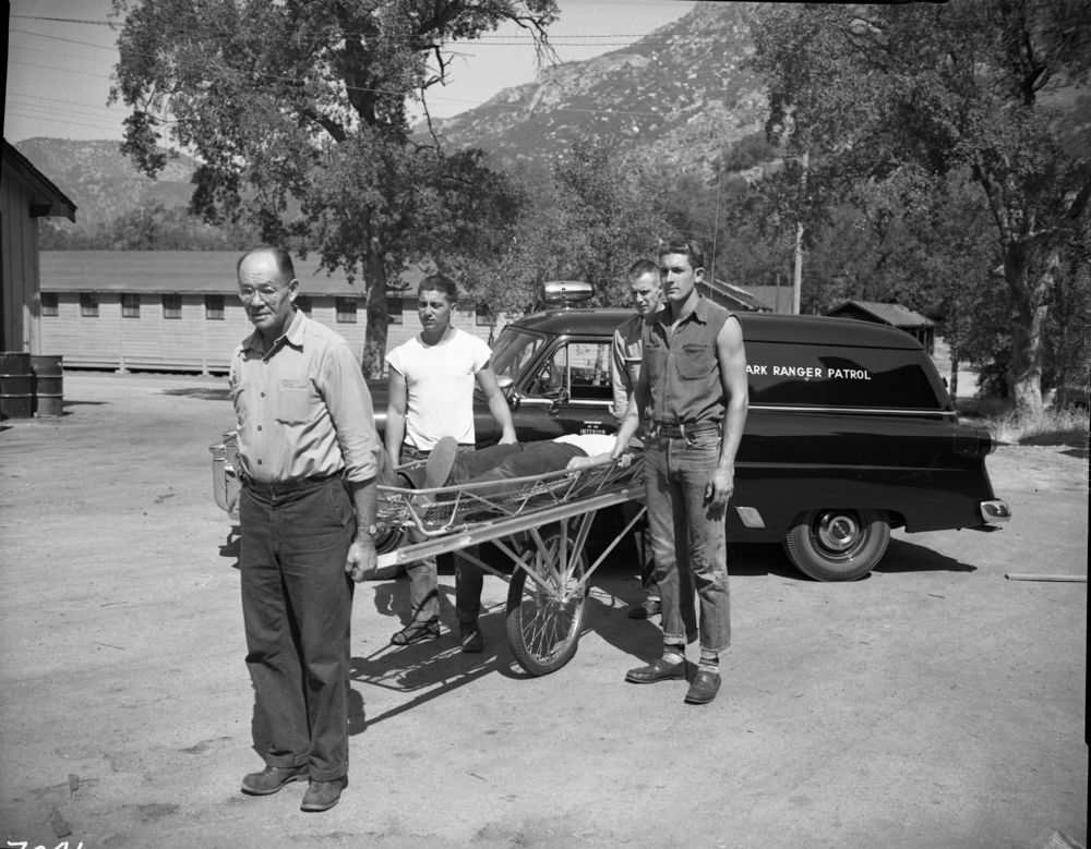 Unknown Photographer, 540000, Ash Mountain, SNP, Vehicles and equipment, rescue basket. NPS Individuals. L to R: Basil Bradshaw, ?, ?, Dick Boyen.