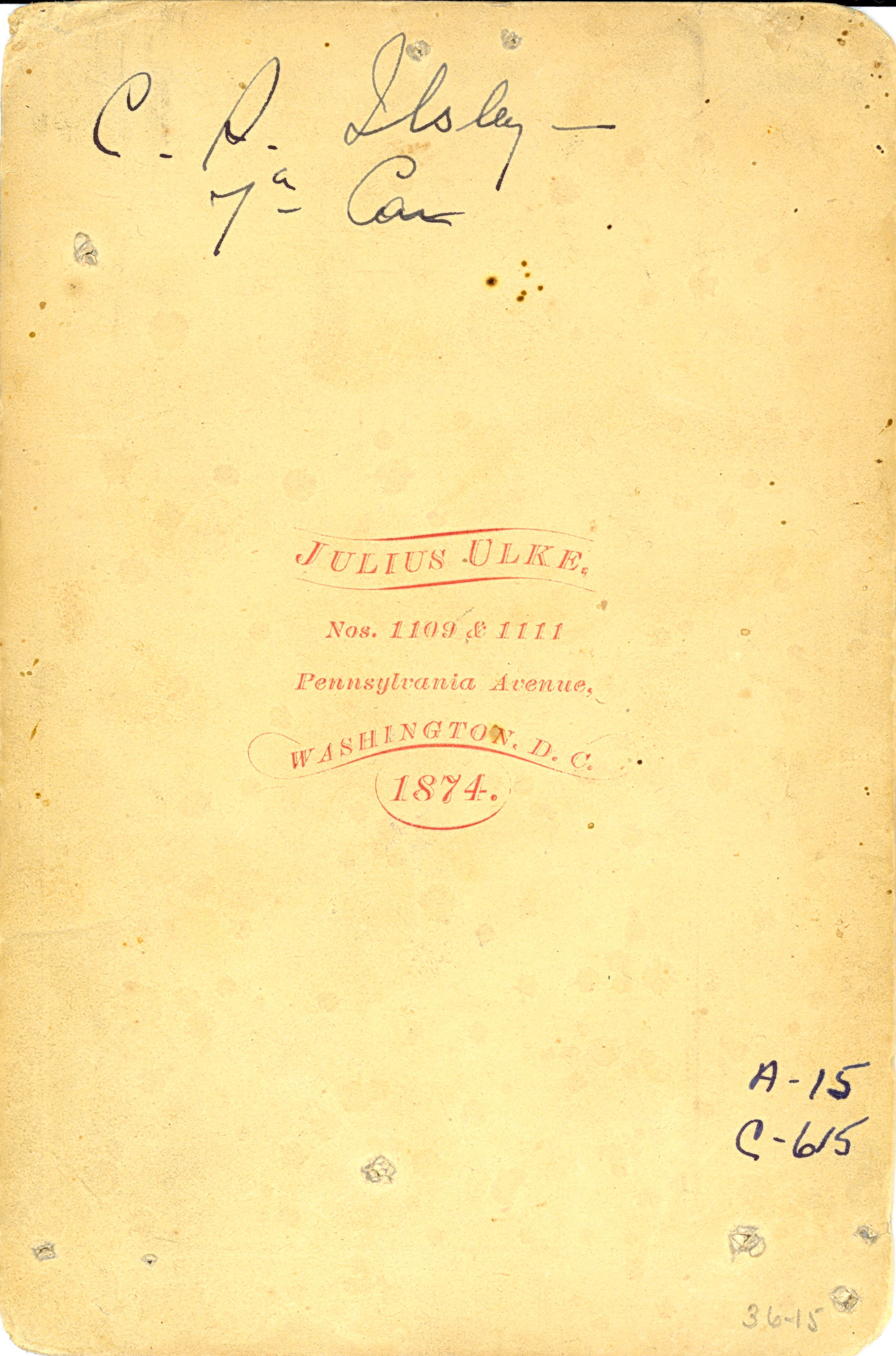 LIBI_00015_00615; An albumen cabinet card (card photograph) of Captain Charles Ilsley, 3/4 length view, in full military dress; studio portrait produced by Juliun Ulke, circa 1874; handwritten ink notation on front and verso of print.; cabinet card [card photograph];Courtesy of the National Park Service, Little Bighorn Battlefield National Monument, LIBI_00015_00615, Juliun Ulke, "Captain Charles Illsley in Full Dress Uniform Holding Helmet," circa 1874