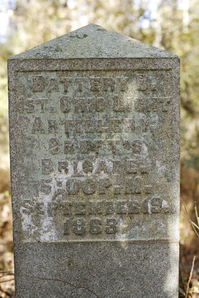 Marker contributes to nat'l significance of park under NR Criterion A because it represents the national movement among veterans & related groups to commemorate Civil War battlefields. || A 1'6" x 1'6" x 3' high granite obelisk with a raised letter inscription. Marks unit's position 300 yards southeast of old blacksmith shop on September 19, 1863, at 5:00 p.m.