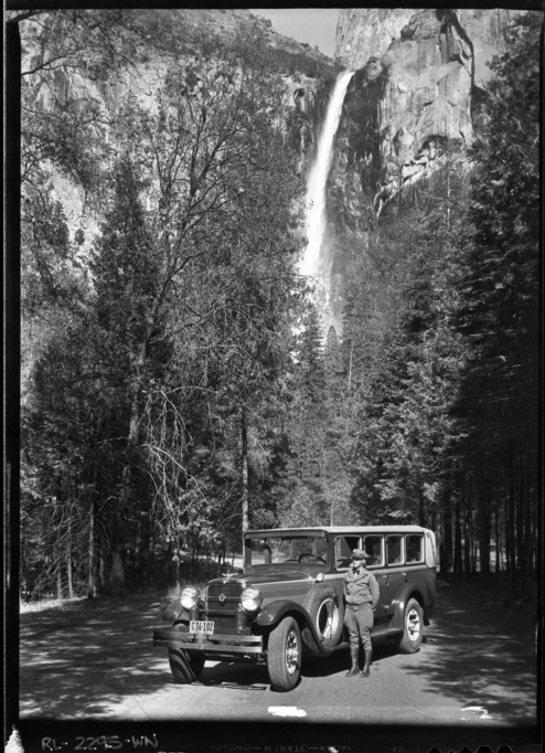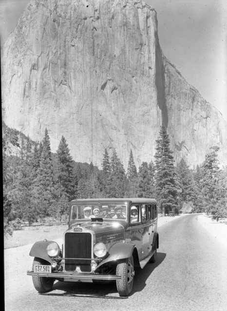 First regular autostage into Yosemite Valley. Mr. Edwin T. Huffman on June 2, 1915, drove the first auto stage of Yosemite Stage and Turnpike Co. into Yosemite Valley over the Wawona Road. This picture taken at that time by Julius Theodore Boysen marked pa