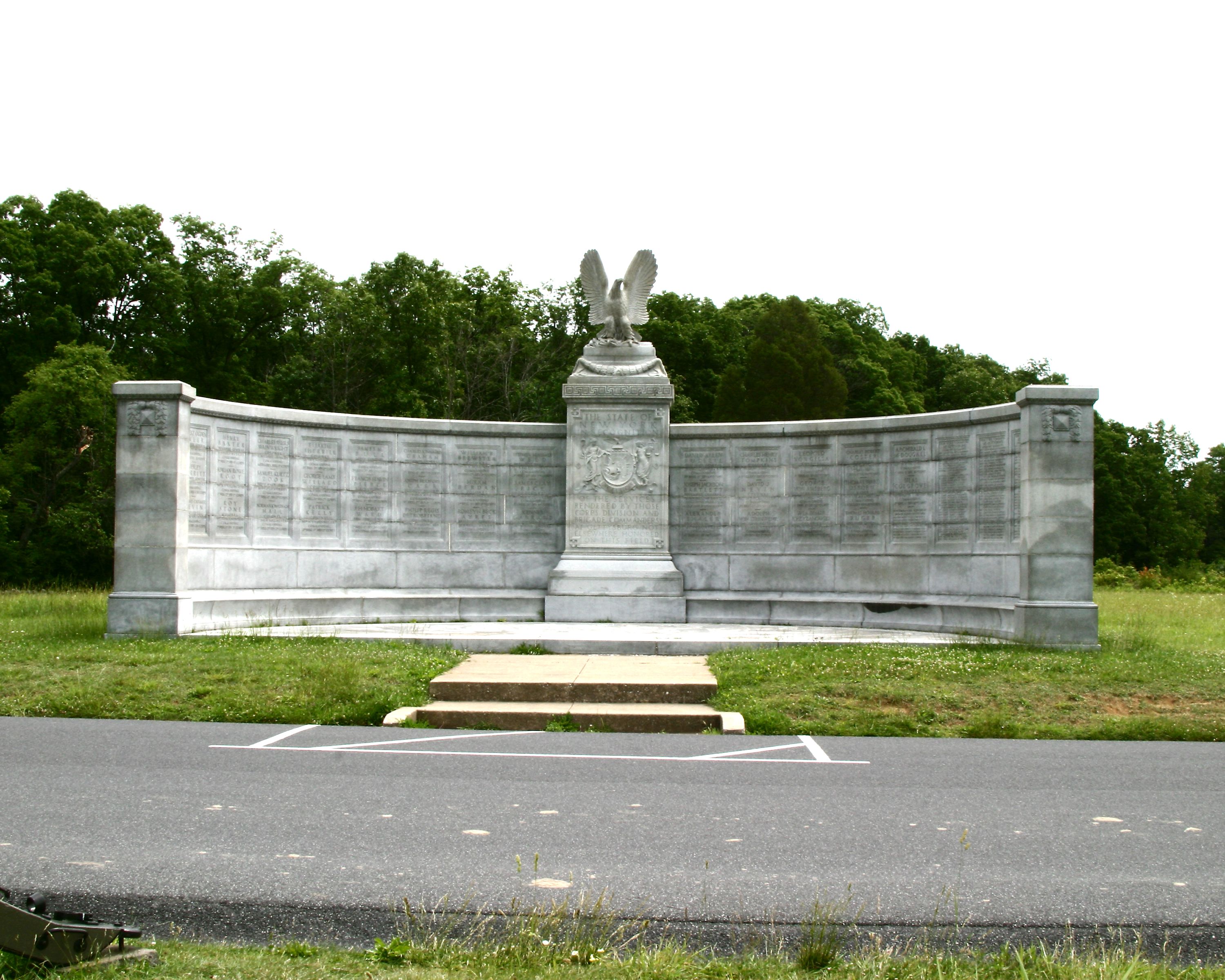 1 of 2 New York State Monuments. Erected to commerate NY commanders not listed elsewhere that fought at Gettysburg. Located E side South Hancock Avenue. || Mn, semi-circular 42'L x 24'D x 21' H. Central projecting node of base, shaft incised inscriptions, excised coat-of-arms, topped by spread wing eagle. Incised commander names in circular wall portions. Granite walk to Mn 8'x 14'w/2risers 8."