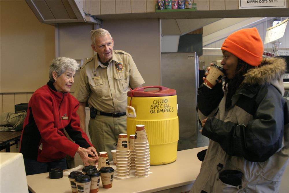 At Cuyahoga Valley National Park volunteers perform a wide variety of duties during every season of the year. Currently over 2,021 volunteers donate over 70,195 hours to the park. || Volunteers serve hot drinks to people participating in the Ohio Special Olympics winter games.