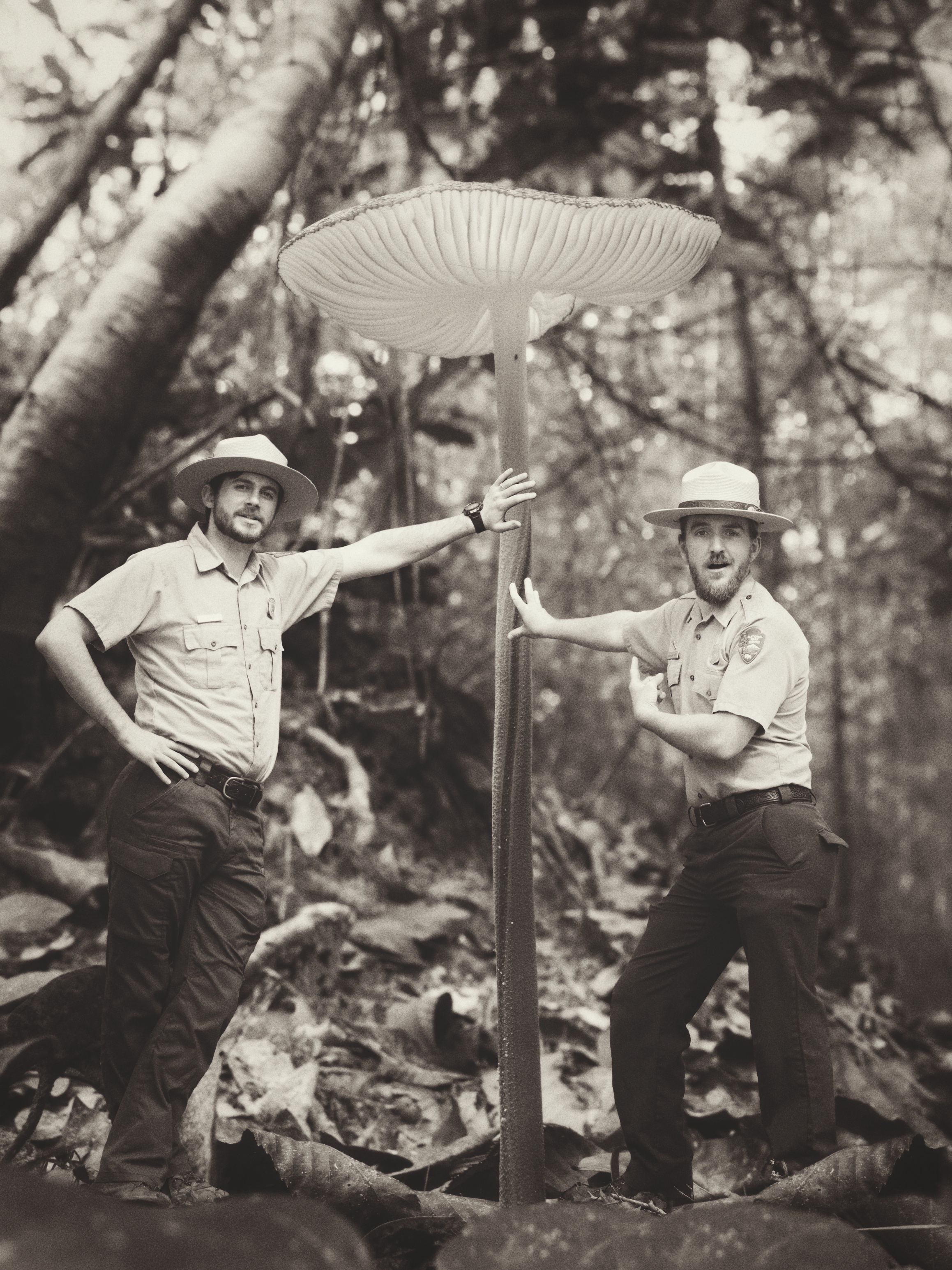 Edited black and white photo of a tall, slender mushroom with 2 park rangers inserted to make it look like they were posing next to it.