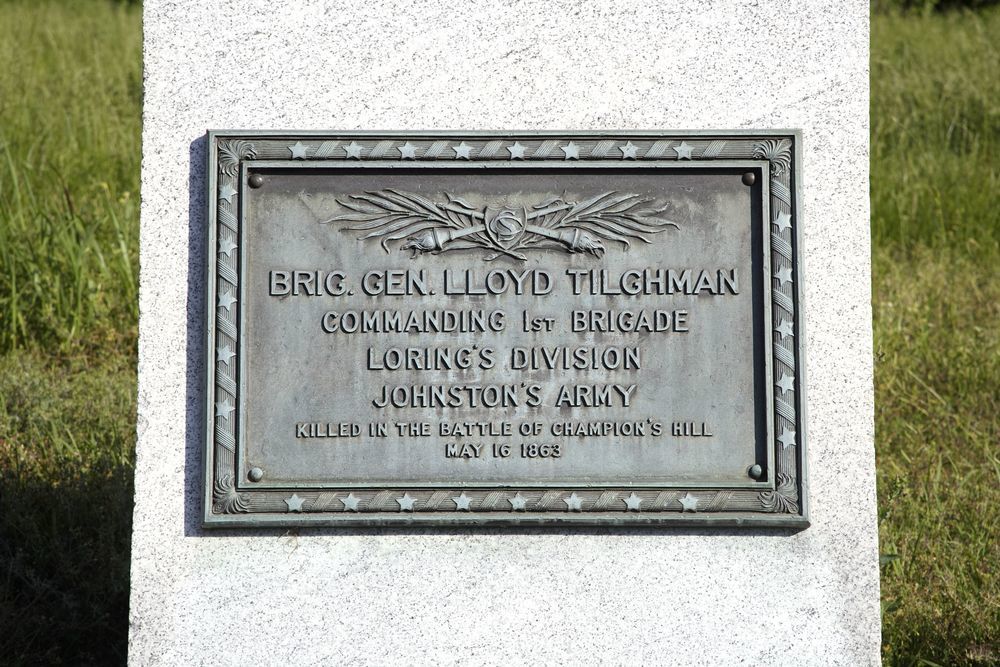 44" x 24" x 52", rectangular gray granite monument with a bronze inscription tablet attached to its slanted face. Tablet has decorative border of stars and tells of Tilghman's death in the Battle of Champion's Hill.