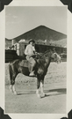 Edna Devlin on horseback with Scotty's Castle Hacienda under construction in background. Circa 1930. Inscription in pencil, on reverse: 1. Black and white, 2 x 4 inch, horizontal format. Corner mounted in photograph album.