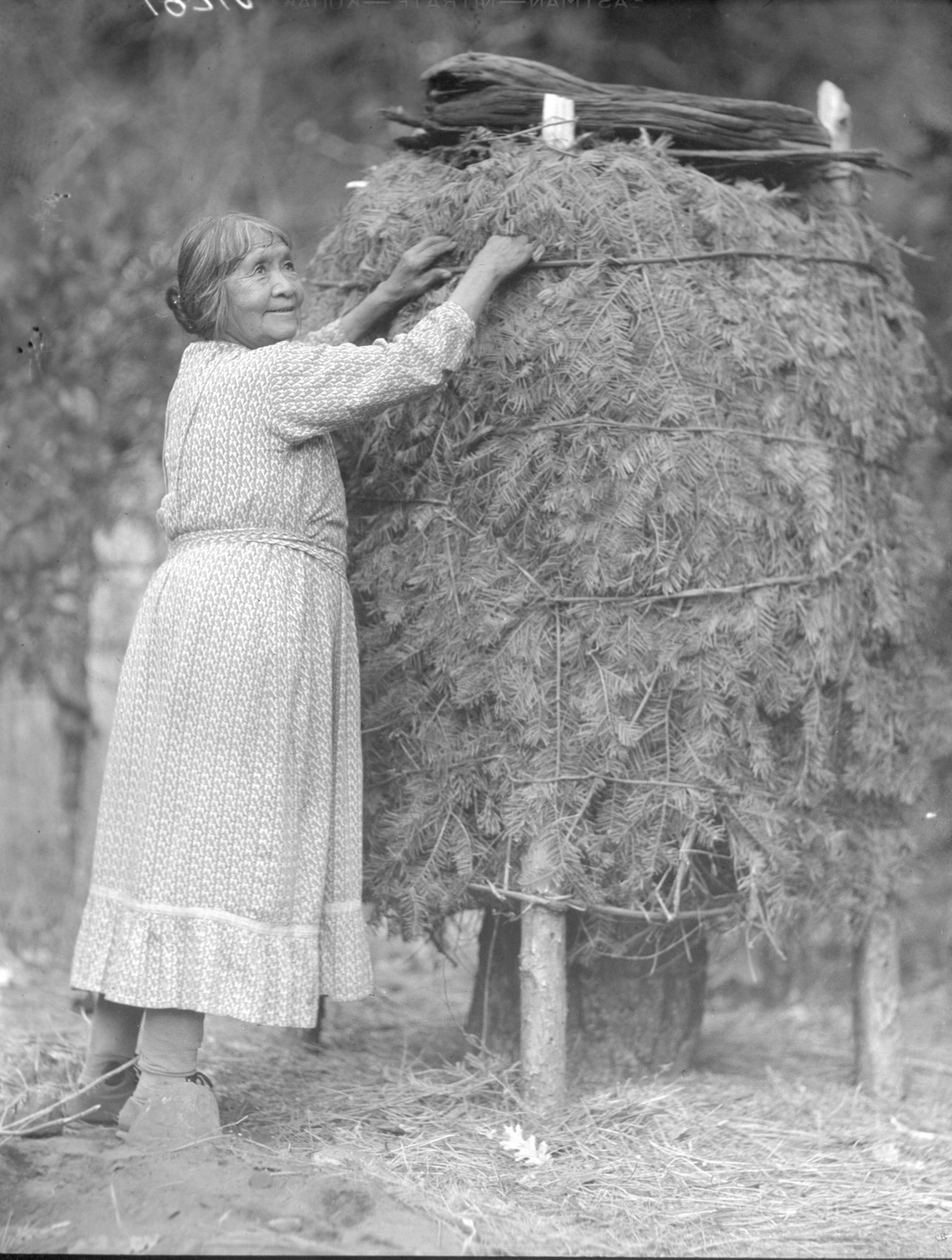 Ta-buce- (Maggie Howard) filling Chucka with acorns. Note: She stands inside to line chucka and place the acorns. Chucka is thatched later.