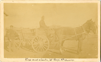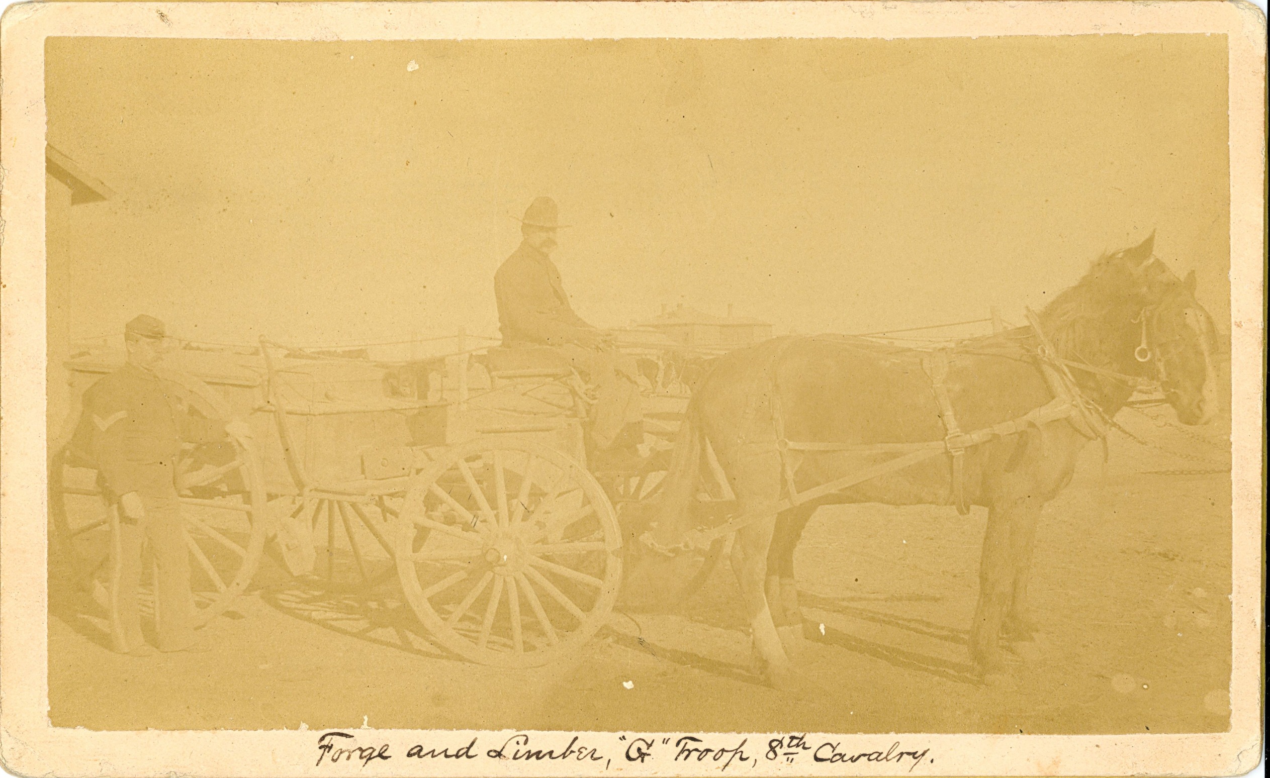 LIBI_00011_14872; An albumen photograph, mounted on card, depicting Forge and limber style wagon from G Troop, 8th Cavalry, including a sergeant standing beside the wagon and a private seated in the driver’s seat. Handwritten ink description in on the bottom of card mount reads “Forge and Limber, “G” Troop, 8th Cavalry.” Created by an unknown photographer on an unknown date. Image is fading and yellowing.; PRINT, PHOTOGRAPHIC [Mounted on card]; Courtesy of the National Park Service, Little Bighorn Battlefield National Monument, LIBI_00011_14872, Unknown Photographer, "Forge and Limber Style Wagon with a Private and Sergeant from Troop G of the 8th Cavalry," date unknown