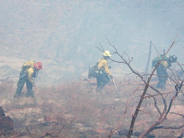 Fire fighters working on fire lines during the Long Mesa fire at Mesa Verde National Park, summer 2002.