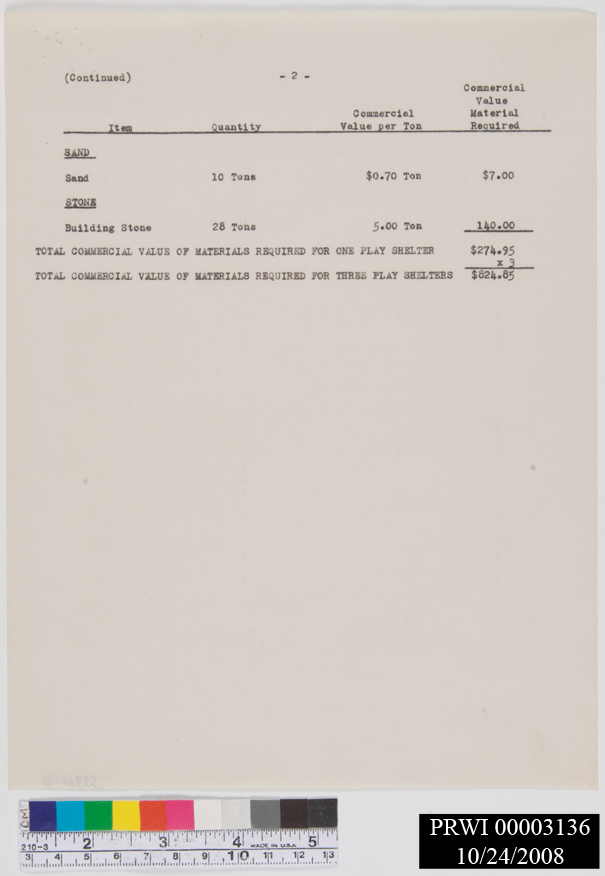 SHELTER, PLAY. CAMP 3. JOB #119C<CRCAMP 3. INCLUDES JUSTIFICATION, SPECIFICATIONS. JOB APPLICATION & COMPLETION RECORD.<CRREVISIONS. MATERIALS LOCALLY PRODUCED AND PURCHASED. DISCRIPTION AND COST. MATERIALS FROM<CRFROM OTHER SOURCES.<CR#3131, THRU 3136, SAME FILE FOLDER. CAMP 3. CORRESPONDENCE, LETTER OF COMPLAINT.<CRSTAPLES, RUST, CARBON TRANSFER. YELLOW PAPER. TORN.