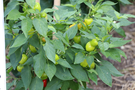 Green and red bell peppers growing on a leafy plant.