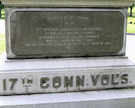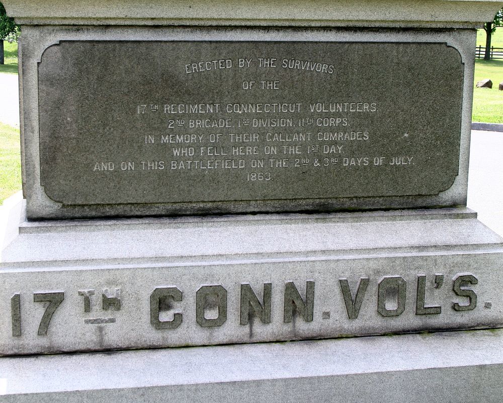 1 of 8 Connecticutt Monuments. Denotes general location of regiment July 1, 1863 before retreat to East Cemetery Hill. Located at Barlow Knoll on E Howard Avenue. || Mn fnd base 5'x8', 2 part shaft. 1st part has excised polished letters, 2nd part has polished excised tablets & crests w/ incised inscriptions. All 7' H. Staining on mn.