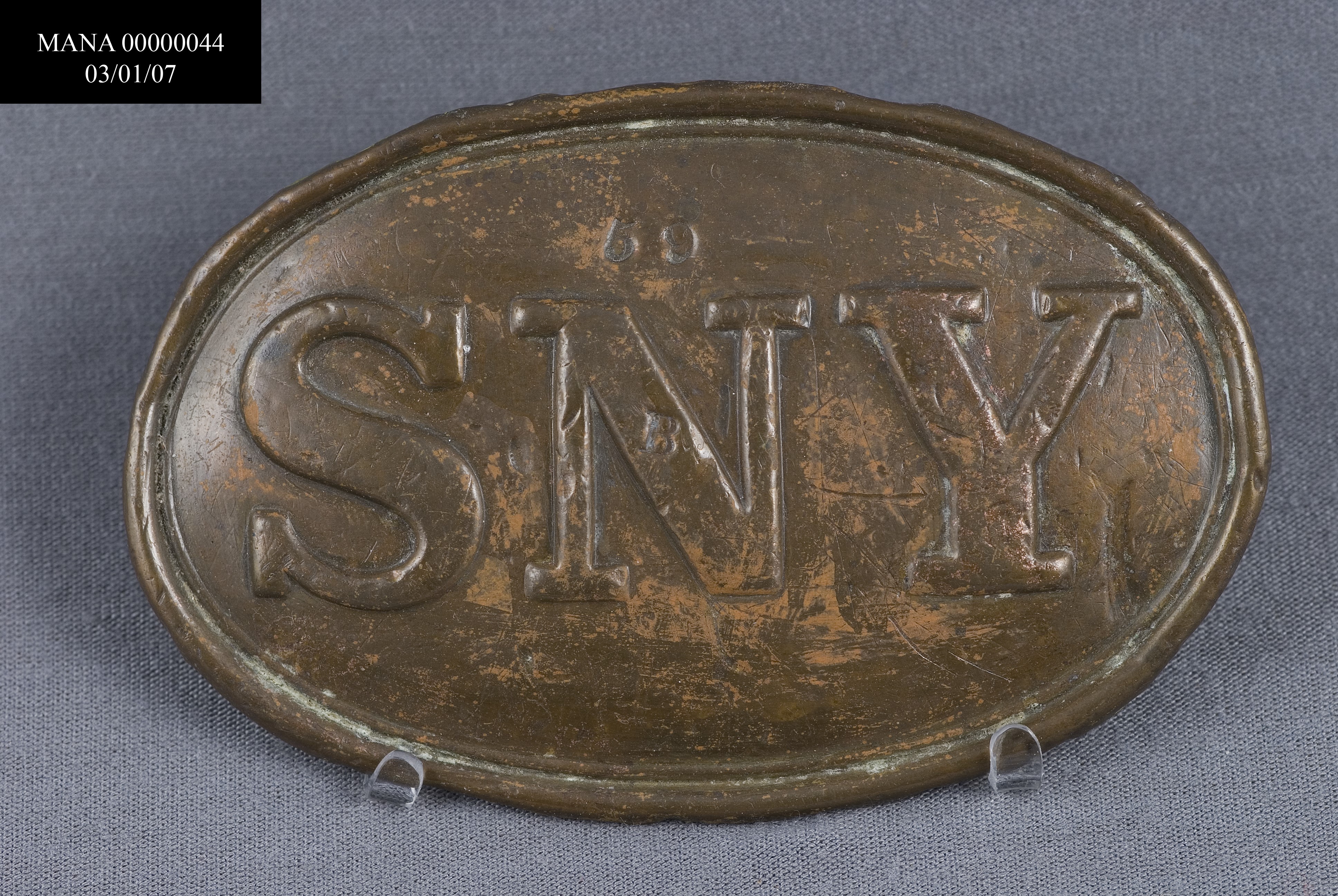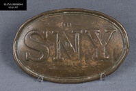 STATE OF NEW YORK WAIST BELT PLATE HAVING LETTERS "SNY" ON FRONT. OVAL SHAPE. A SMALL "59" STAMPED ABOVE THE "N"; A SMALL "B" STAMPED INTO THE CENTER BAR OF THE "N".