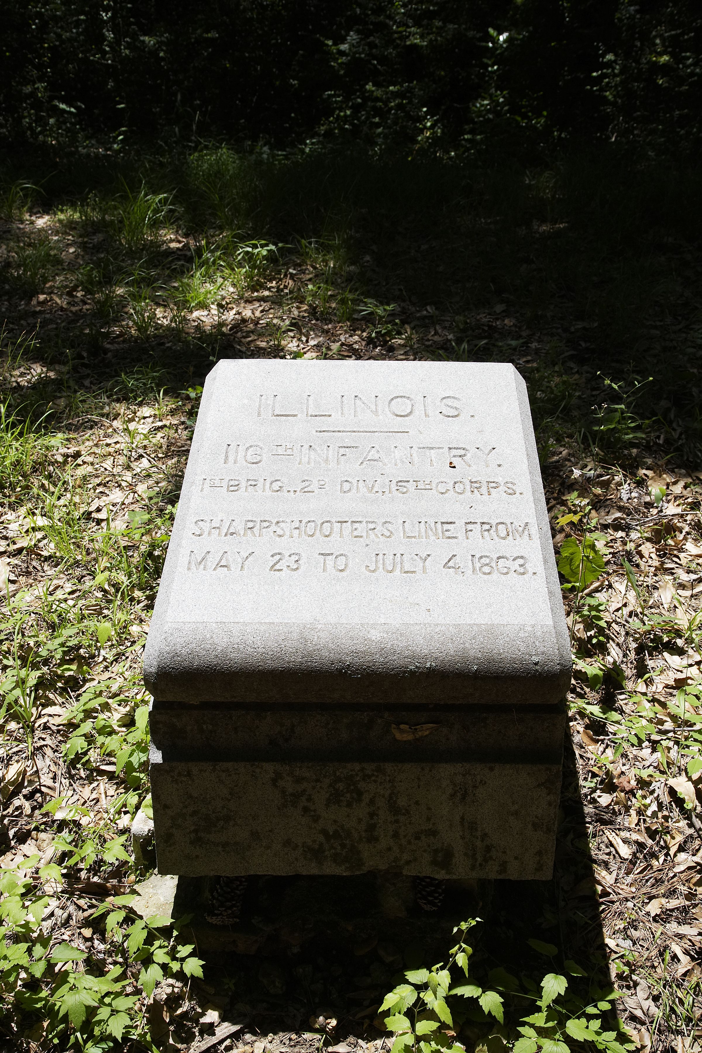22" x 29" x 16" gray granite marker consisting of a nearly horizontal tablet with beveled edges and inscribed with "ILLINOIS", unit designation, and appropriate information.