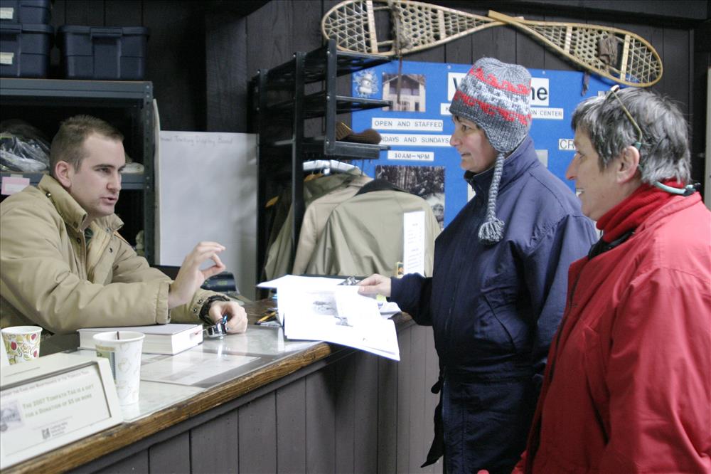 Children make crafts with Park Ranger Paul Motts inside the Winter Sports Shelter. Families enjoy hot drinks. SCA intern provides information to visitors. || During the winter months, the Kendall Lake Shelter becomes CVNP's Winter Sports Center. Services include cross-country ski and snowshoe rentals and winter recreation programs.