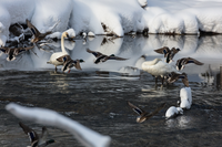 Mallard ducks land in water next to trumpeter swans in winter