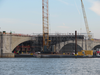 Scaffolding and a construction work place are set up on the water next to the bridge
