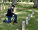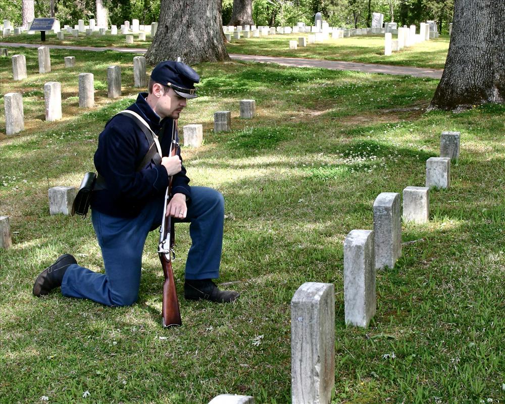 Park ranger in Civil War Union soldier costume poses in Shiloh National Cemetery