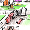Cartoon drawing of the President's House Site featuring a red brick fireplace and portico door.
