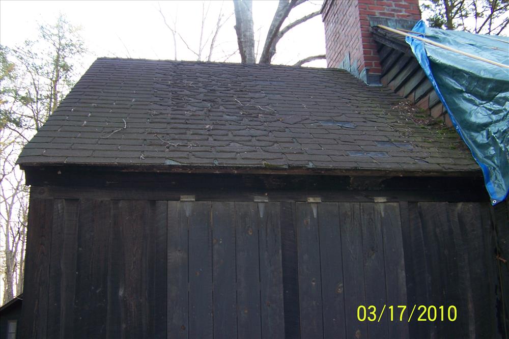 Picture of roof and siding on lodge B-12 in Cabin Camp 5 prior to roof replacement and staining of siding work being started by day labor crew in March 2010 at Prince William Forest Park.