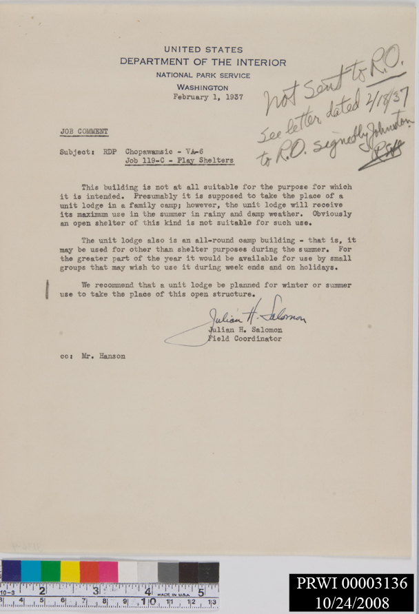 SHELTER, PLAY. CAMP 3. JOB #119C<CRCAMP 3. INCLUDES JUSTIFICATION, SPECIFICATIONS. JOB APPLICATION & COMPLETION RECORD.<CRREVISIONS. MATERIALS LOCALLY PRODUCED AND PURCHASED. DISCRIPTION AND COST. MATERIALS FROM<CRFROM OTHER SOURCES.<CR#3131, THRU 3136, SAME FILE FOLDER. CAMP 3. CORRESPONDENCE, LETTER OF COMPLAINT.<CRSTAPLES, RUST, CARBON TRANSFER. YELLOW PAPER. TORN.