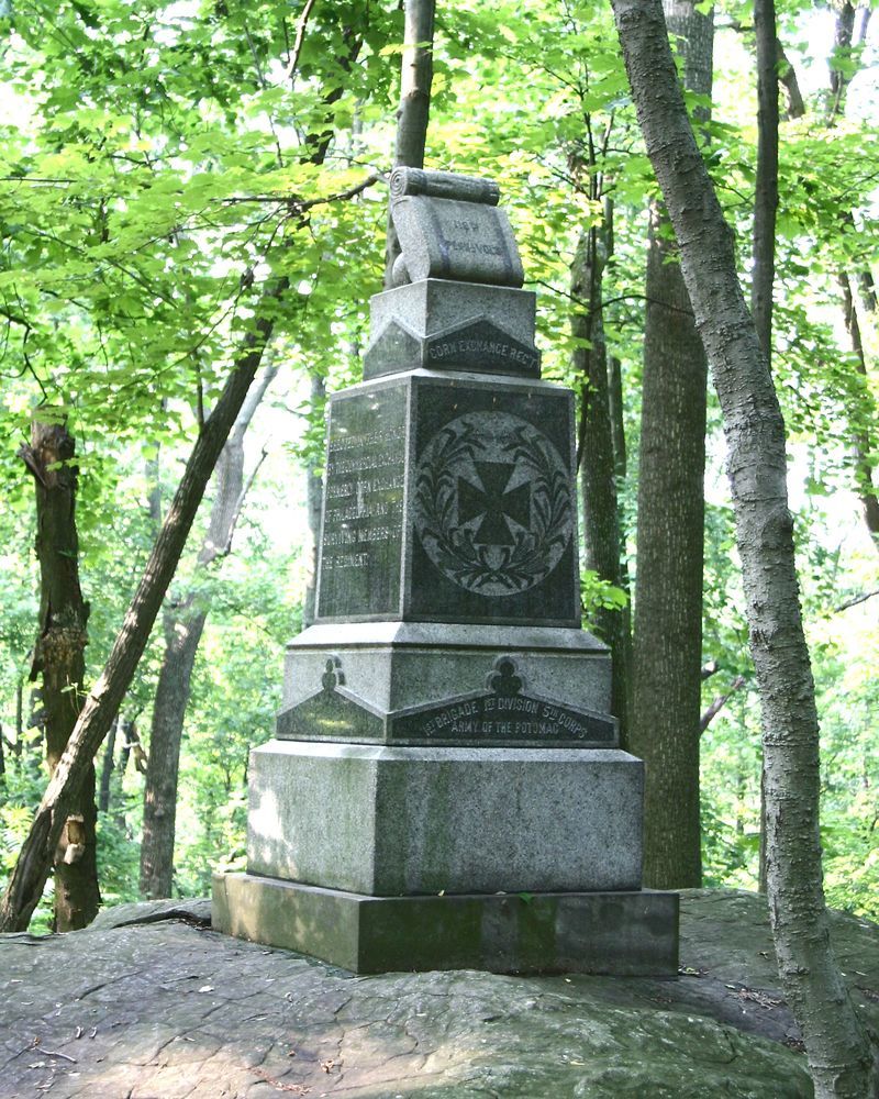 Marks location of 118th Pennsylvania on July 3 & 4, 1863. 1 of 110 mns honoring Pennsylvania units in Gettysburg Campaign. Located on NW slope of Big Round Top, on old Commission path. || Base, 3' square, resting on boulder. Shaft, 2' square. All 8' high. polished w/ insised inscriptions & carved representation of a V Corps Maltese cross & shocks of corn. Topped w/ a block & knapsack propped against cannon balls.