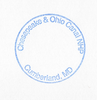 A blue, circular stamp with "Chesapeake &Ohio Canal NHP" on the top and "Cumberland, MD" on the bottom.
