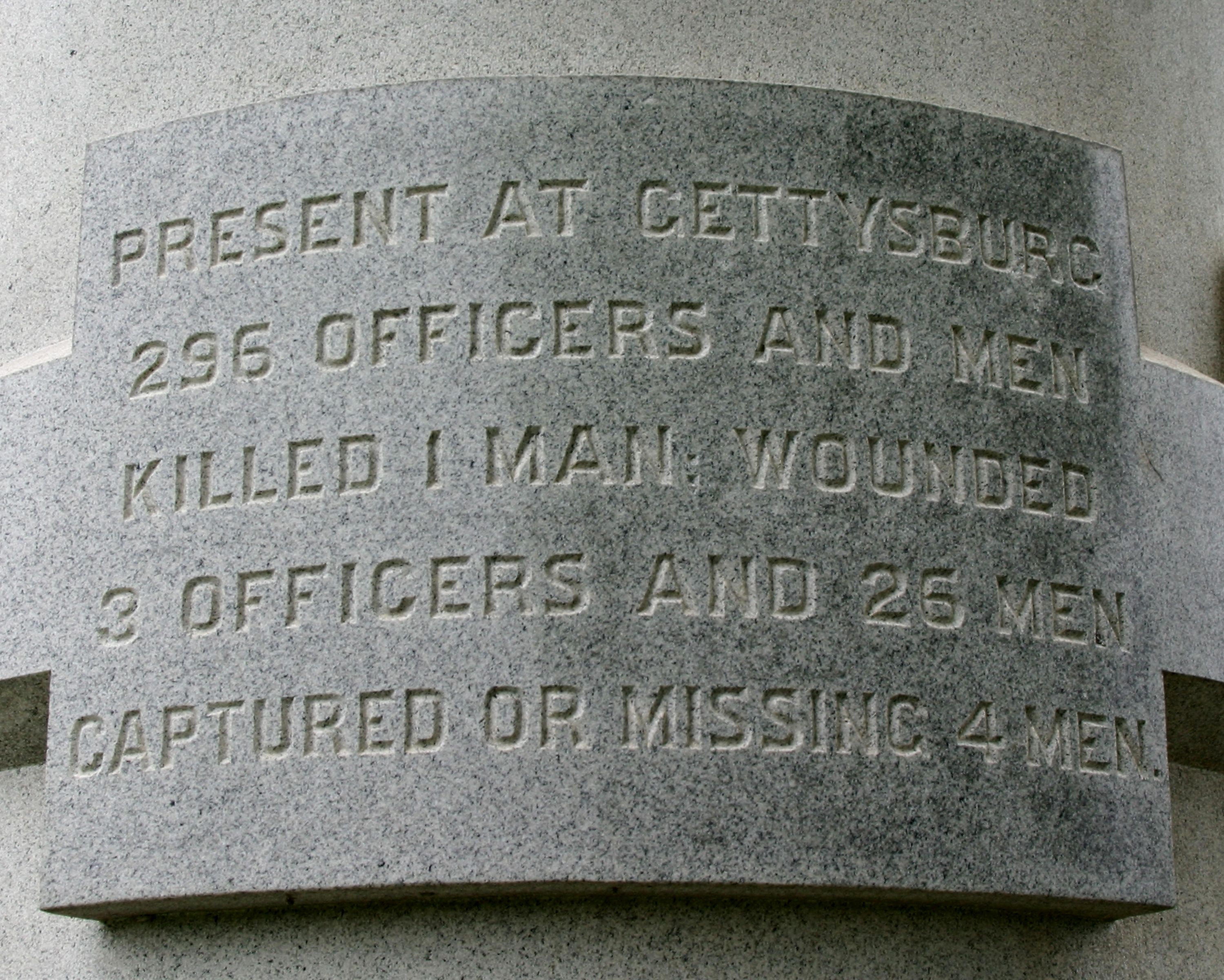 1 of 110 mns in Park to PA commands in Gettysburg Campaign. Marks position held by skirmisher of 63rd PA on July 2, 1863. Located on NW corner of intersection of Emmitsburg & Wheatfield Rds. || All members cylindrical. Tapered rough-hewn base, 16'4'in circum. at bottom. Smooth shaft, 12' in circum. All 11'5" high. Raised inscriptions panels, Bronze State seal on E. Rough & smooth striped dome cap w/ 4 sided-diamond finial.
