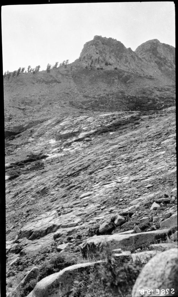 High Sierra Trail Investigation, east to Elizabeth Pass from 10,000' elevation. Right panel of panorama. Neg. copied reversed.