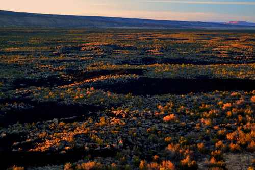 An out-of-frame sunset casts a gold glow on the bushes that cover the black lava flows.