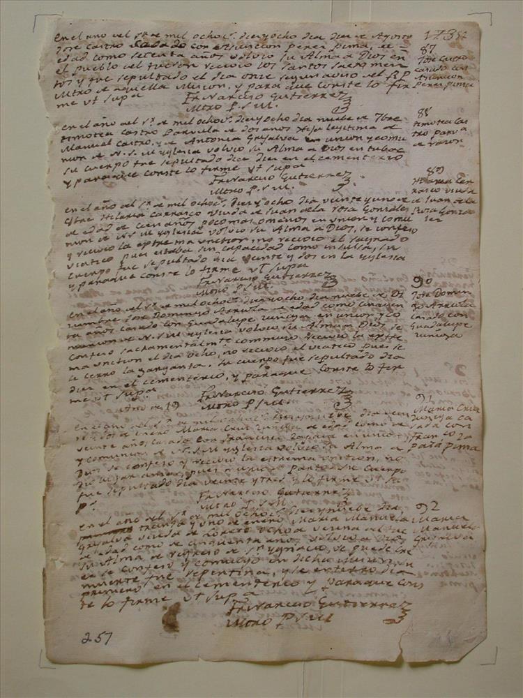 Tumacácori Mission Record, page 257 || 87 - José Castro, married to Asunción Pérez, a Pima. In the year of the Lord 1818 on the 10th day of August, José Castro, married to Asunción Pérez, a Pima, he being about seventy years of age, returned his soul to God in the village of Tucson. He received the holy sacraments and was buried on the 11th, according to what I have been advised by the minister of that mission. And for these truths I signed as above. = Fray Narciso Gutierrez (rubric), Minister of His Majesty