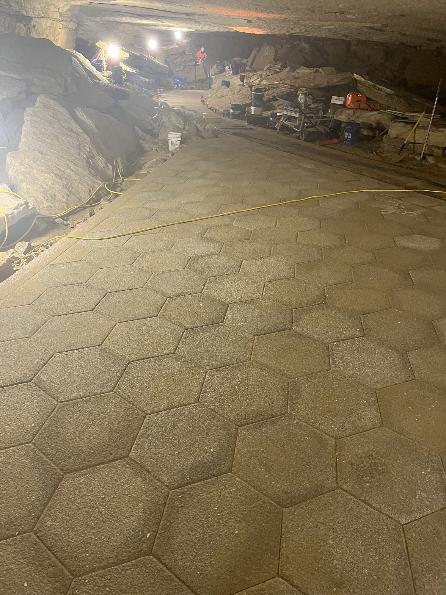 Paving stones provide a durable surface for gathering along the Domes and Dripstones cave tour route.