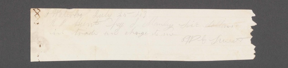 On front of document: "Waterloo July 25 43 R P Hunt pay J Marley Six dollars in trade and charge to me W E Sweet" On back of document: "W E Sweets order"