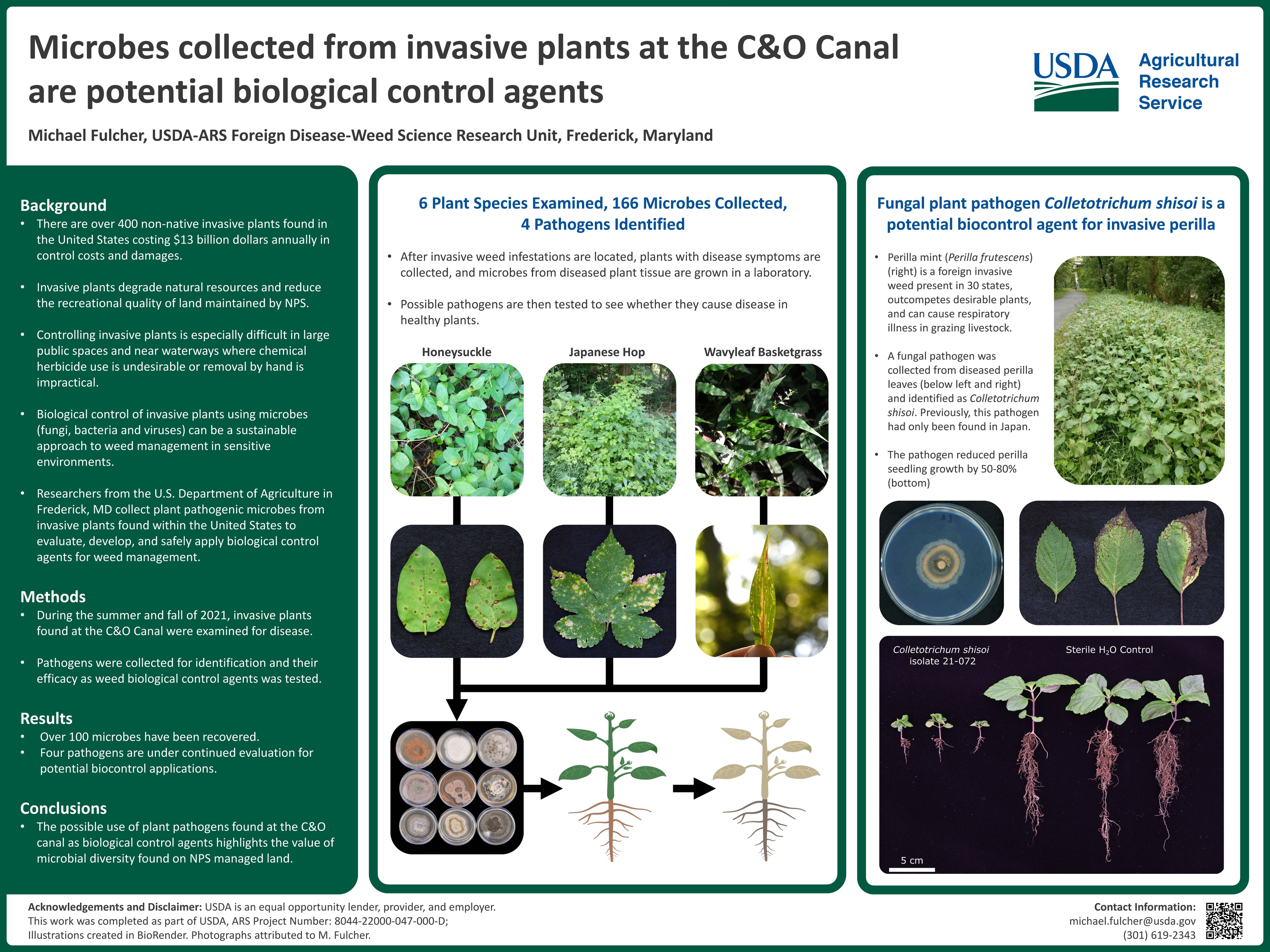 Invasive plants degrade natural resources and reduce the recreational quality of landmaintained by NPS. Controlling invasive plants is especially difficult in areas where chemicalherbicides are undesirable or mechanical removal is impractical. Biological control ofinvasive plants using microbes (fungi, bacteria and viruses) can be a sustainable approach toweed management in sensitive environments. Researchers from the U.S. Department ofAgriculture are collecting microbes from plants at the C&O Canal in order to evaluate theirefficacy as weed biological control agents. Over 100 microbes were recovered from invasiveplants in 2021, including a fungus not previously recorded in the United States thatsignificantly reduces the growth of invasive perilla mint. The possible use of this plantpathogen as a biological control agent highlights the value of microbial diversity found onNPS managed land. Note: poster developed for the National Capital Region Spotlight 2022.