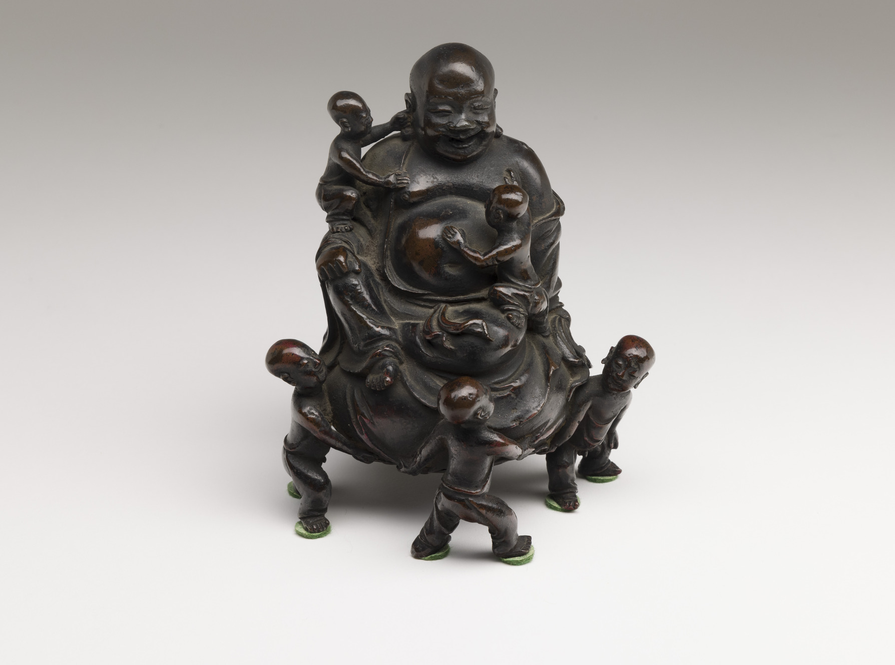 Small bronze Japanese incense burner (koro) depicting Hotei supported by four boys with a smaller boy seated on his lap rubbing his stomach and a sixth boy crouched on his right arm. Hole for incense stick located near proper left shoulder.