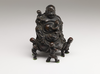 Bronze figure of seated fat bald man held by three small figures with two more small figures climbing on him.