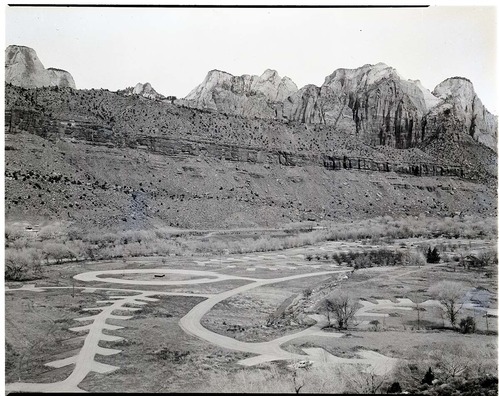 New Watchman Campground from hills on west side of Zion Canyon. ; ZION Museum and Archives Image 003_01B018 ; ZION 7715
