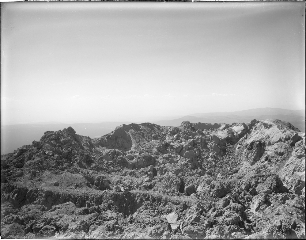 Benjamin F. Loomis Historical Photograph Collection:Crater on Lassen Peak summit showing new lava formations created during the eruptions in May of 1915. Otto Albers standing in crater at bottom center shows the scale of the crater.