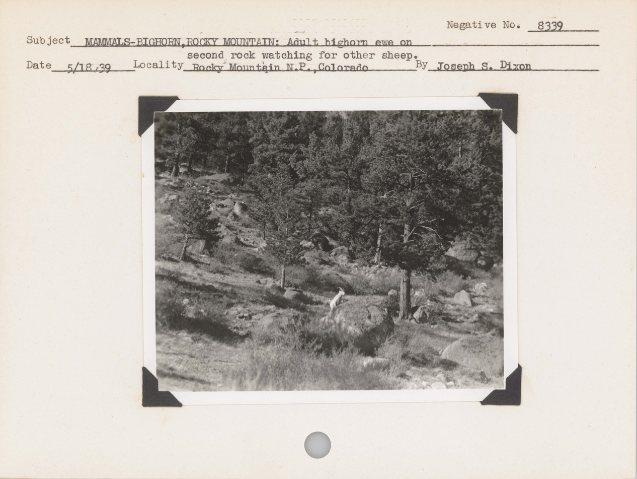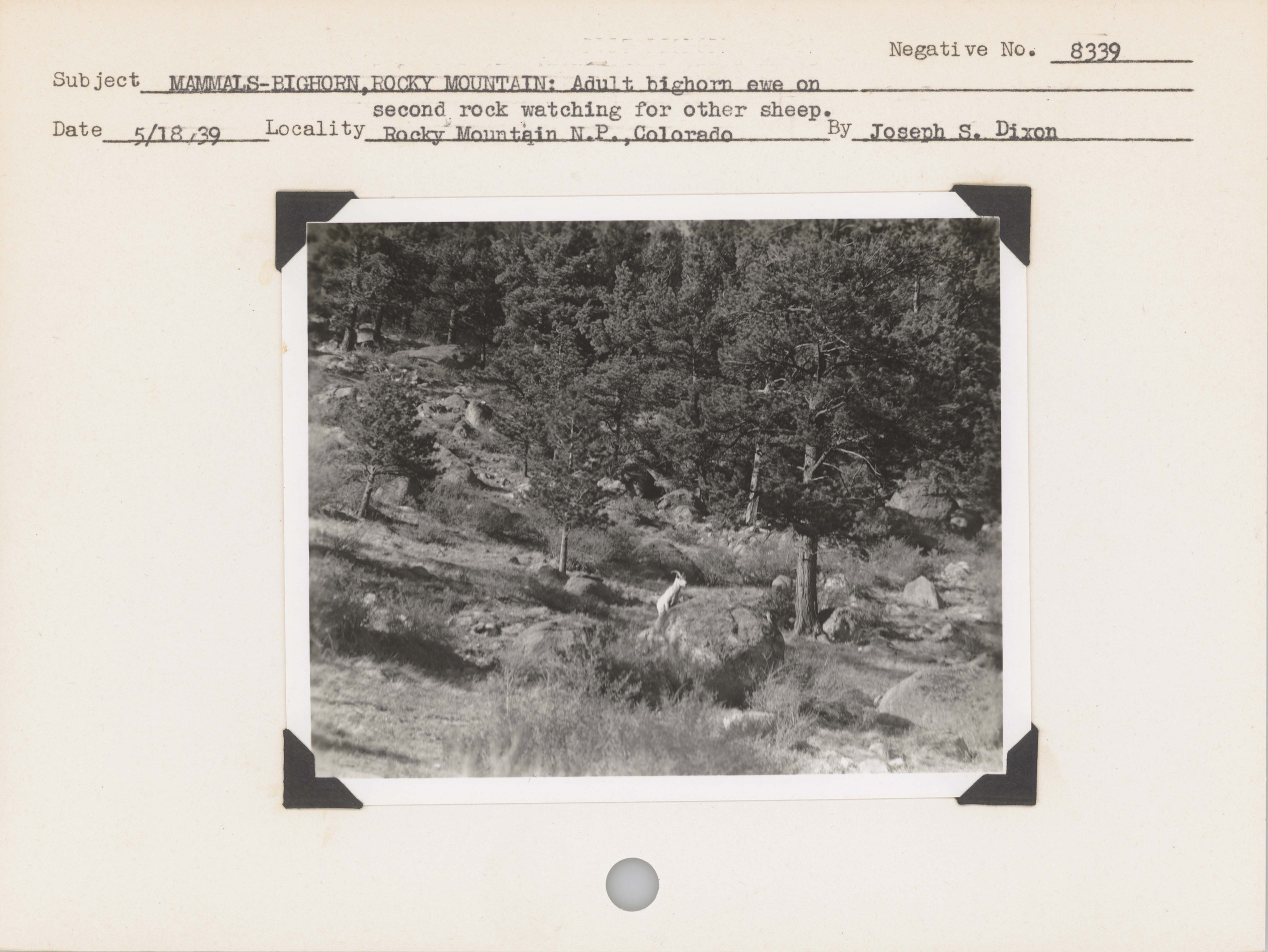 Mammals--Bighorn, Rocky Mountain--Adult bighorn ewe on second rock watching for other sheep. Locality: Rocky Mountain National Park, Colorado. Negative #: 8339
