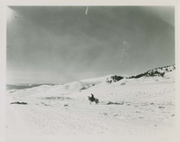Elk reduction program 1942. Ranger dragging elk shot in Lamar Valley to roadside for trucking to Buffalo Ranch. Negative #: 42-284. Locality: Lamar Valley, Yellowstone National Park. Location of Negative: Yellowstone National Park. [This information comes from the reverse of the envelope, and the reverse of the print for this negative number].